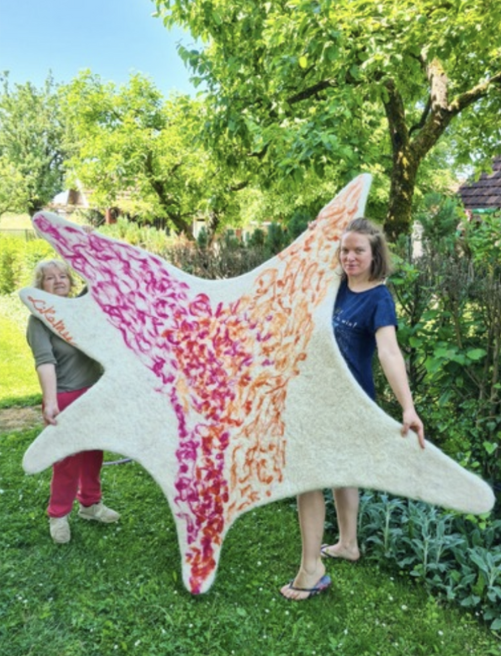 Perfect Star is one of my favourite designs. First and foremost it is a star with 6 arms, then it is an unexpected shape of a rug, further on orange-pink-white is my favourite colour combination. Once we decided to make something big, we didn’t even think it would be as big as it came out to be. Also, when I picked orange and pink as colours I had no idea in which direction I was going pattern-wise, but the hand was just leading me and I followed. As I was pinning those fluffy layers of coloured wool the design of a pattern just slowly developed in front of my eyes and very soon I could see it so clearly in my head. Once it was finished, I just sat down and looked at it in amazement. I loved it and still do as much as I loved it the first day.