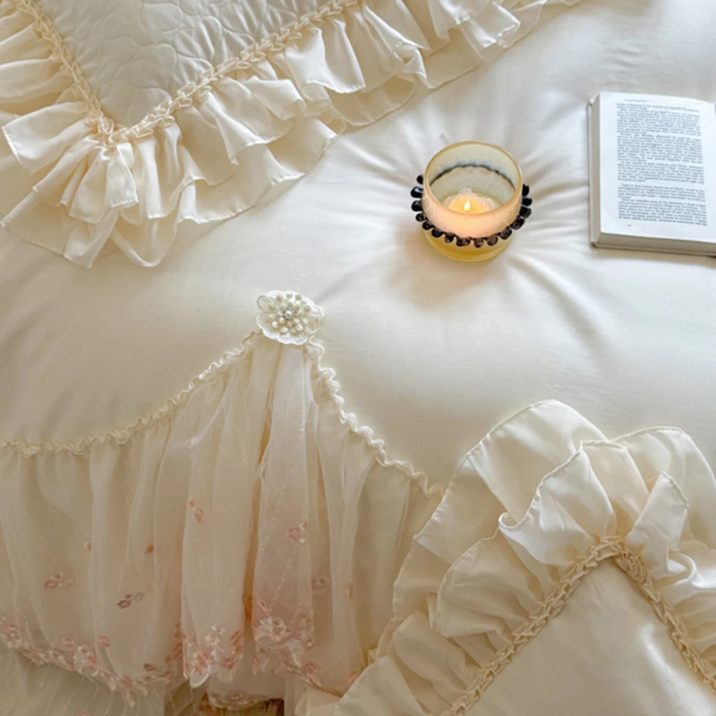 - Design Highlight: Soft-white duvet cover with white-and-pink tiny floral embroidery — two pearl-centered floral appliqués at the scalloped lace start points — tiered ruffle bedspread with a heart-quilted top and a scalloped embroidered-floral lace hem — lace-ruffled pillow shams complete the cottagecore look.
