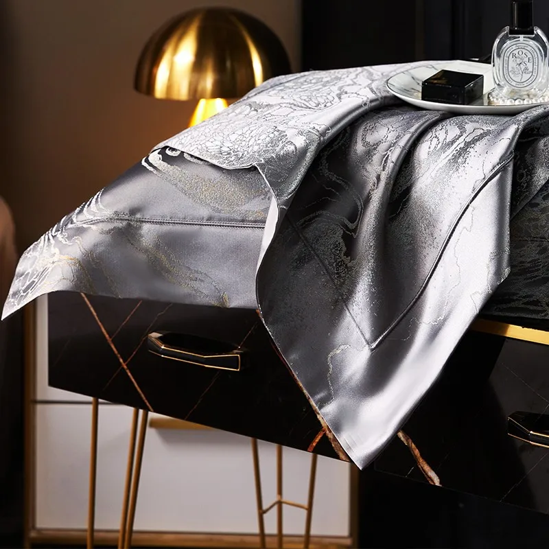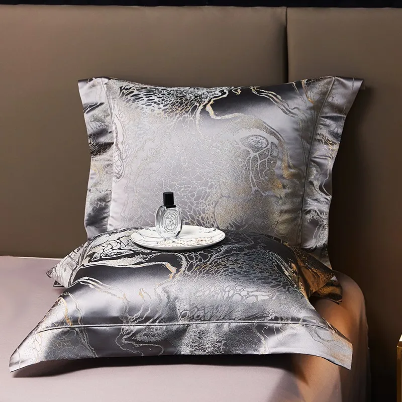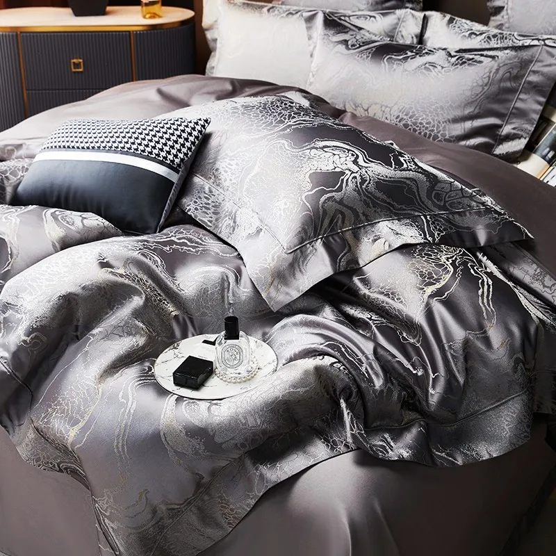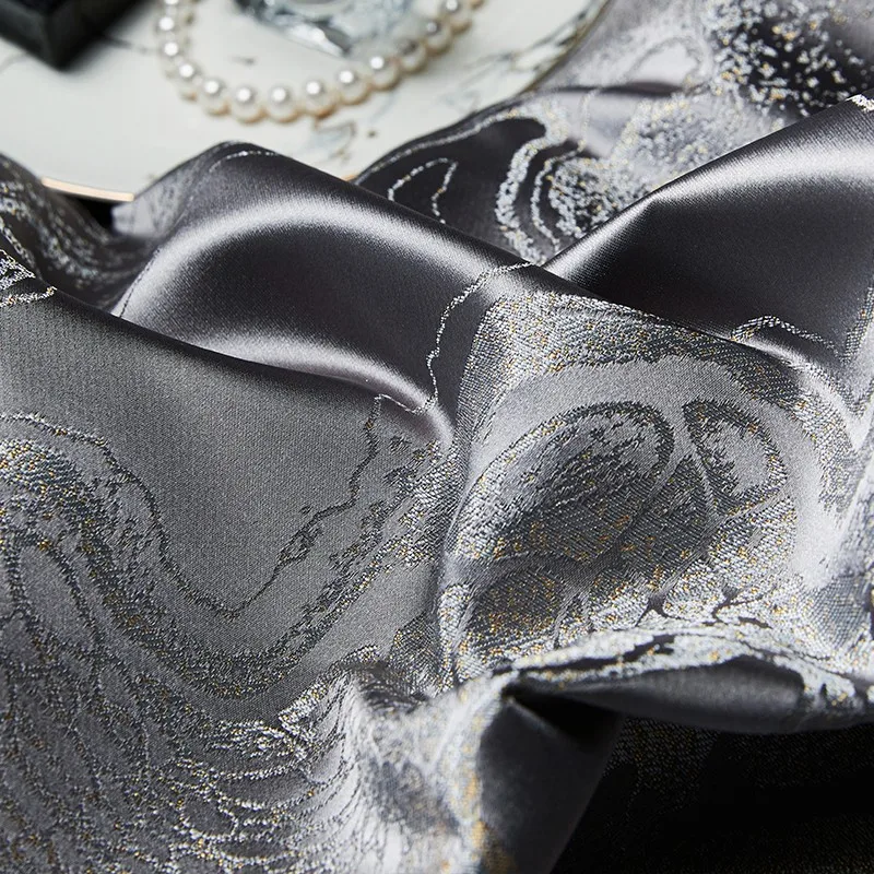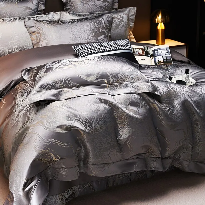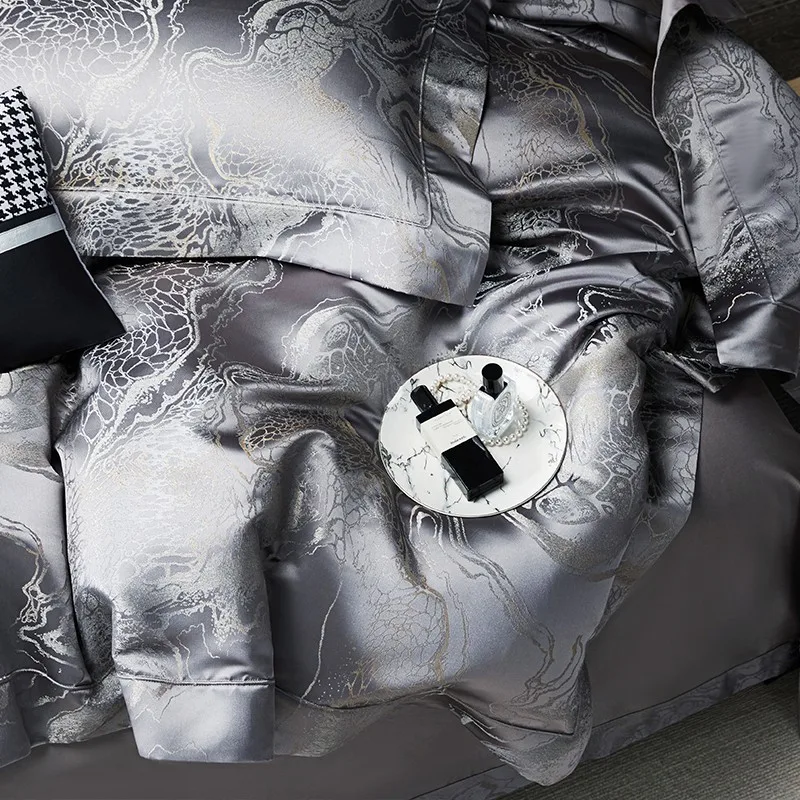 Rich charcoal-grey jacquard with platinum metallic accents creates a sophisticated, masculine luxury that commands attention in any modern bedroom.Lustrous Jacquard Depth